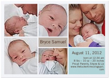 Here is Bryce's birth story for those of you who are curious. For those of you who are not, you have been warned. Bryce's due date was August 8th. When that day came and went, I was getting anxious and ready to do anything to make his arrival come sooner. On August 9th, I spent the day washing the walls in our house and bouncing on my exercise ball! Early the next morning on August 10th, around 1:00 am my water broke. I woke Shane up and he immediately started running around the house, getting dressed, and somehow stubbed his toe during the process. He had the car started before I even had my pajamas off. Off to the hospital we went! Luckily my water broke, but I was not having any contractions, so the hour and half drive to Peoria wasn't as bad as what I had imagined it would be. We got to the hospital and were told to relax and get some sleep while they waited to see if my contractions would start on their own. After about 3 hours and no contractions, they gave me pytocin to get the party started! At 10:30 am the morning of the 10th I was dilated to a 5. I then got the epidural and Shane and I started betting on when he will be born. Unfortunately, the epidural slowed the party down and I was only progressing about 1 cm every two hours. By 6:00 pm I was finally to a 9! It had been a long day, but the next time they checked me I was ready to push and meet our baby boy. But, when they checked me again at 8:00 pm I had somehow gone backwards to a 7. Oh no! And, Bryce's heartbeat was going up and down, so they backed off the pytocin. At this point it had been almost 20 hours since my water had broken. I was exhausted, Shane was worried, and Bryce was suffering, so my doctor suggested we do a C-section. We agreed. They prepped us for surgery, and we were on our way. Bryce was born at 12:34 am on August 11th weighing 8 lbs, 10.8 oz, and 20 inches long. After a very long day, we finally got to meet our baby boy! We both cried when we saw him in the delivery room! Here are only a few of the pictures from that memorable day!